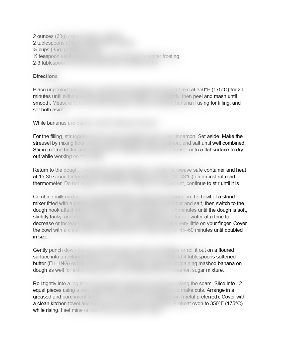 Main ingredients: bananas, milk, butter, brown sugar, granulated sugar, egg, instant yeast, all-purpose flour, salt, cinnamon, cream cheese, powdered sugar, vanilla extract