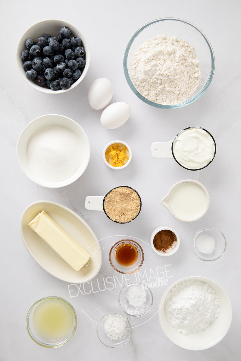 Main ingredients: blueberries, flour, baking powder, baking soda, salt, butter, egg, vanilla extract, lemon, sour cream or Greek yogurt, milk, brown sugar, cinnamon, powdered sugar