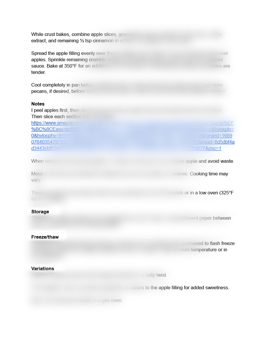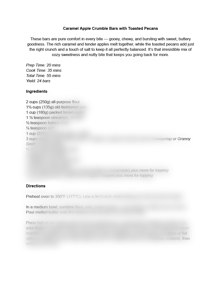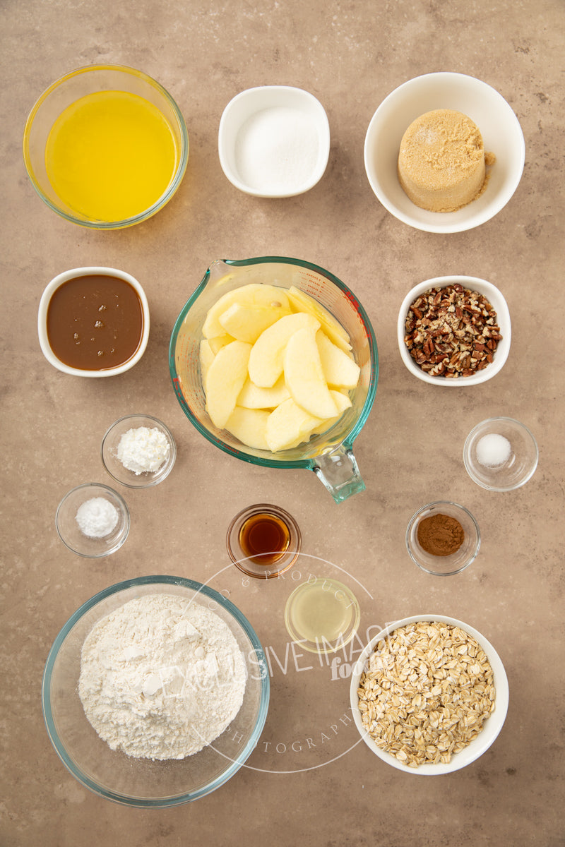 Main ingredients: flour, oats, brown sugar, baking soda, salt, cinnamon, butter, apples, sugar, cornstarch, lemon juice, vanilla extract, caramel sauce, pecans