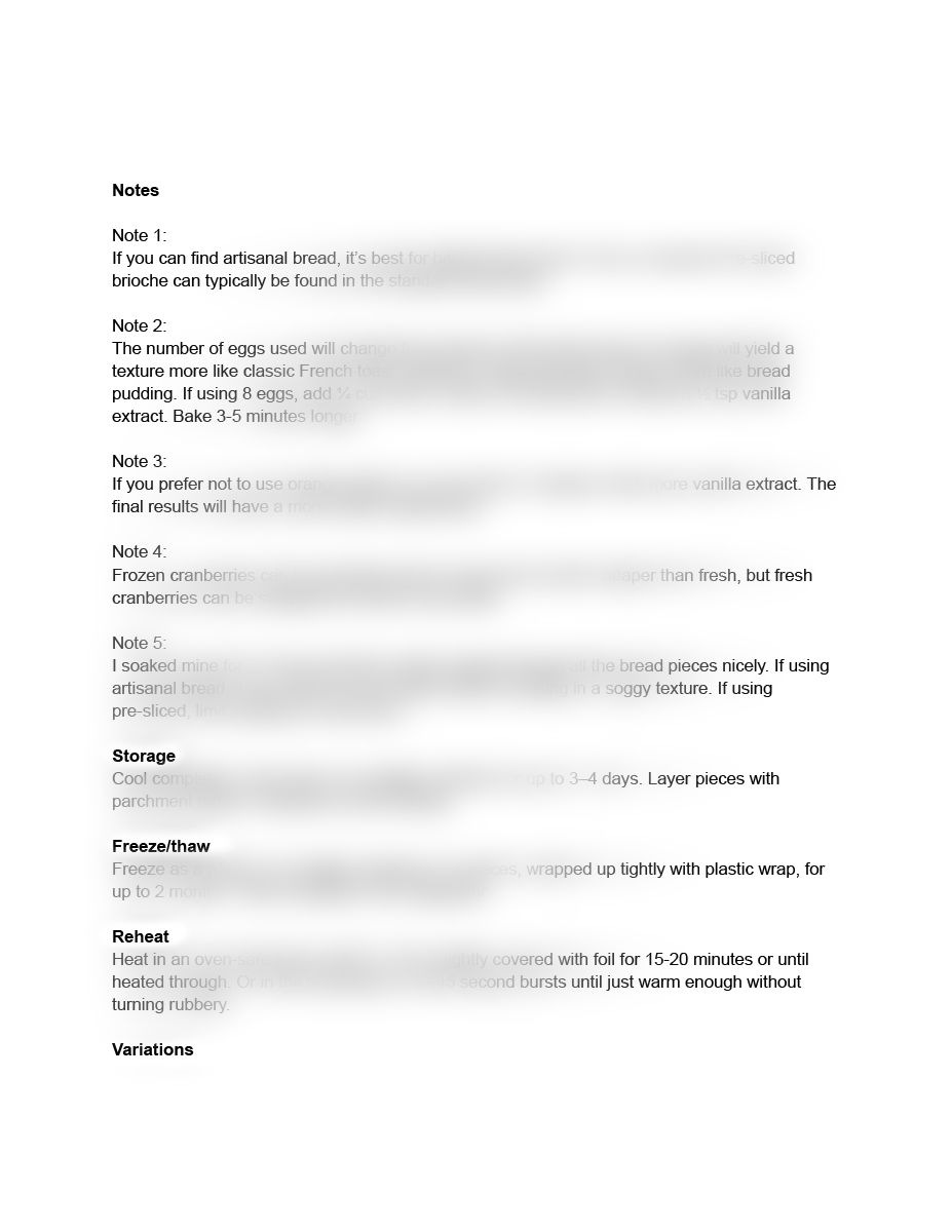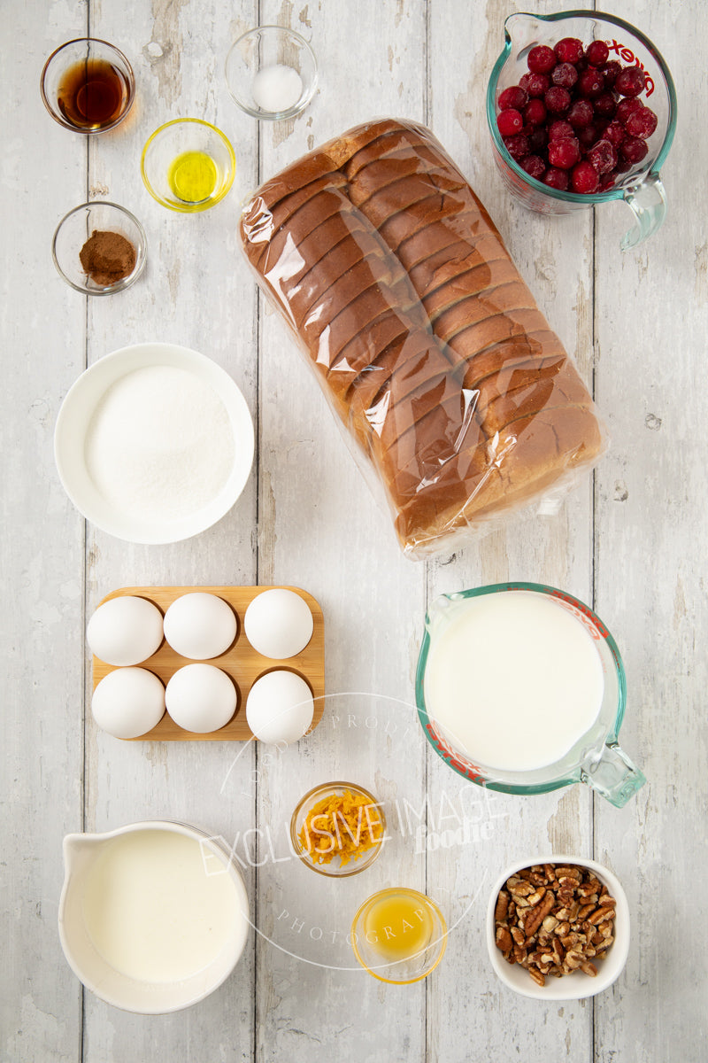 Main ingredients: brioche bread, eggs, milk, heavy cream, sugar, orange juice & zest, cinnamon, salt, vanilla extract, orange extract (optional), frozen cranberries (or fresh), pecans or almonds (optional)