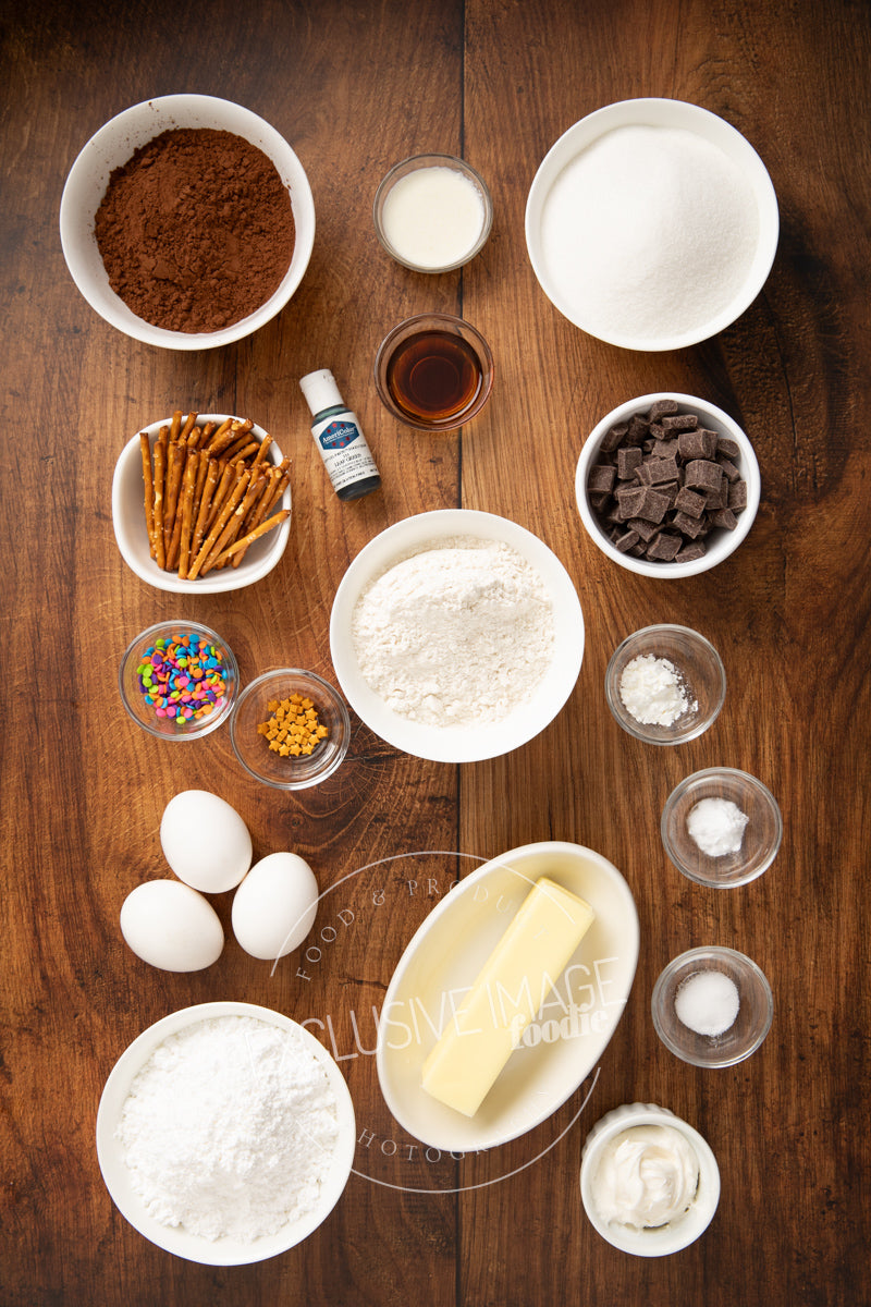 Main ingredients: butter, sugar, cocoa powder, egg, vanilla extract, flour, cornstarch, salt, baking soda, powdered sugar, heavy cream, gel food coloring, sprinkles. Optional: semi-sweet chocolate chunks, pure white canned frosting, pretzel sticks, candy canes